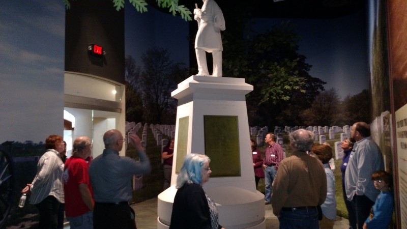 Our tour of both museums was expertly guided by Ms. Gina Radandt, Curator of Collections at the Kenosha Public Museum. Highlights included an overview of exhibits at both museums plus a “backstage” visit to the preparation lab at the Civil War Museum, where we were able to view an assortment of Civil War items. We also toured a storage area and workroom in the Kenosha Public Museum. Everyone was fascinated by the mammoth exhibit at the KPM which included a gigantic reproduction of the nearly complete Hebior Mammoth skeleton, the oldest and most complete mammoth skeleton ever excavated. Both the Hebior and the somewhat less complete Schaeffer mammoth were found and carefully excavated in nearby Kenosha County farmers’ fields and both had been killed and butchered by humans more than 14,000 years ago. According to Dan Joyce, one of the excavators (now Director of the Kenosha Public Museum) “…the Schaefer and Hebior sites are the best evidence for early dates of people in North America.” It was a real thrill to think of these enormous creatures roaming in our “backyard” so long ago and to learn that our distant human relatives were there to hunt them.
