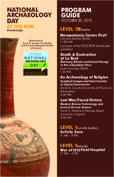On Saturday 20th October the Royal Ontario Museum, together with the AIA-Toronto Society, organized a day of events to celebrate National Archaeology Day. Nearly 3000 visitors enjoyed the many archaeologically-themed activities for all the family in Currelly Hall. Children and adults alike made their own Minoan head-dresses and Egyptian collars, explored the ROM with an archaeological scavenger hunt, wrote their names in ancient scripts, learnt how to think like archaeologists through excavation and fieldwork activities, and discovered conservation methods by mending broken pots. Throughout the day, ROM curators and conservators presented ancient bronze, ceramic and glass objects and Greek and Roman coins to fascinated audiences, while archaeology students from the University of Toronto talked about their fieldwork experiences on excavations in Turkey, Syria, Crete and Peru. Re-enactors from the War of 1812 (soldiers from the Glengarry Light Infantry, and Dr Dunnfore, a field medic) brought the past to life with demonstrations and military drills. At the same time, in the Eaton Lecture Theatre ROM curators and visiting speakers gave a series of public lectures about archaeology ranging from Ancient Mesopotamia, Greece and Cyprus to Peru. For more details of the day see the ROM blog building up to the event at http://www.rom.on.ca/en/blog/national-archaeology-day-rom.