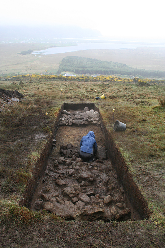 Our work on this part of Slievemore has included the investigation of a pre-bog linear feature known to antiquarians as the ‘Danish Ditch’. The feature extends between the ‘Cromlech Tumulus’ roundhouse and a Neolithic court tomb, before looping south down the mountain. Today it is just about visible as a low ridge in the peat covering this part of Slievemore. Between 2014 and 2016 three slot trenches were dug across the ‘Danish Ditch’ by the AAFS. The most exciting results came from the 2016 season when we determined that the feature is not just a single field wall, but may in fact be a formal route way. The 2016 trench uncovered two parallel walls flanking a shallow terrace. Mid way between the two walls we found a shallow stone setting with deposits of charcoal in it. Could this be a fire pit placed to mark the route? It’s a tantalising piece of evidence but many questions remain.