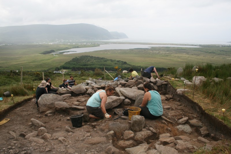 Slievemore is a special mountain. Its slopes bear the traces of over 6000 years of human settlement and activity from the earliest Neolithic megalithic tombs to the ‘lazy bed’ ridges used to grow potatoes until well into the 20th century. One of the busiest periods in the life of the mountain was undoubtedly the second millennium BCE. Since 2006 the Achill Archaeological Field School has been surveying and excavating the remains of an extensive Middle Bronze Age landscape that extended across the southern slopes of the mountain. To date we have excavated three MBA roundhouses and carried out detailed survey of an associated pre-bog field system.