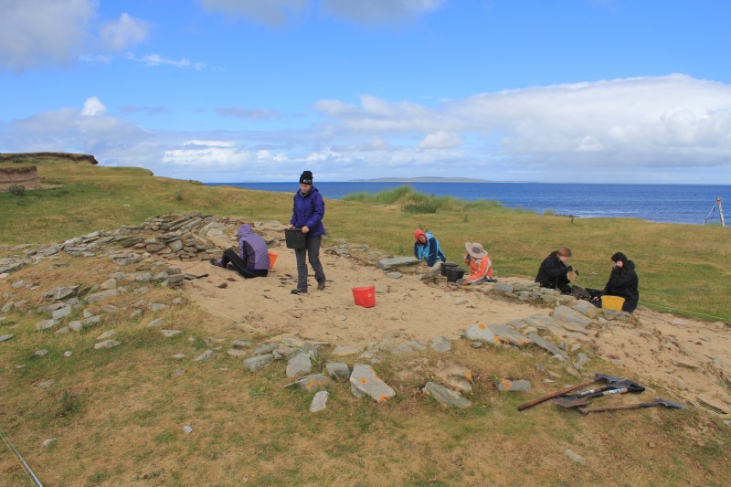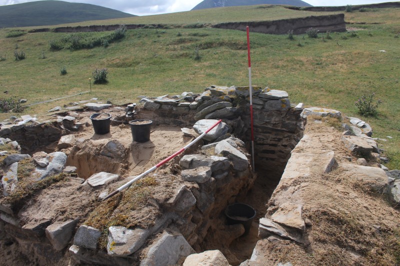 Work continued at Building 3 removing the thick deposits of wind-blown sand. In the western chamber of the structure the sand was up to 1.5m deep! We systematically removed the sand, collecting marine shell and bone by meter square until we hit a series of intact archaeological deposits inside and outside of the building. In the interior of the building we encountered occupation layers consisting of dark brown sand with significant amounts of marine shell (limpets and winkles) and butchered animal bone. Outside of the building we found a thick layer of charcoal-rich material that seems to represent a refuse dump. Our midden trench is progressing well. Due to the very thin and fragile character of the layers we have opted to dig the feature in spits of 5cm. For our Wednesday field trip we headed to Kildavnet old graveyard to practice recording funerary monuments. The graveyard is medieval in origin and has a diverse array of 19th and 20th century headstones.