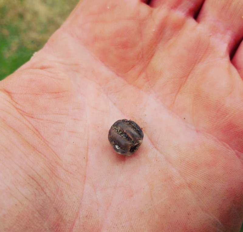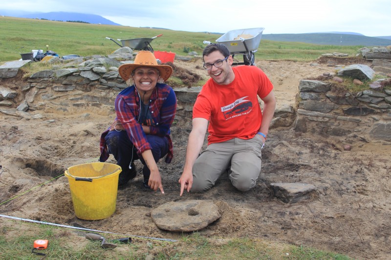 Week 12 started with a number of exciting finds. On Monday morning James and Élsa uncovered a broken hand-mill or quern stone in the refuse area around the north door. Rotary hand-mills were widely used in Ireland from the late prehistoric period onwards. In west Mayo they are attested in the post-medieval period where they were used to grind cereals such as oats and rye to make bread, oatcakes, meal or poitín. Our millstone is made from local schist and has rough circular decoration pecked around its central hole. Over at the midden Cari and her team found a beautiful clear glass bead. Glass beads are known in Ireland since the Iron Age, but the morphology of this example suggests a post-medieval date.