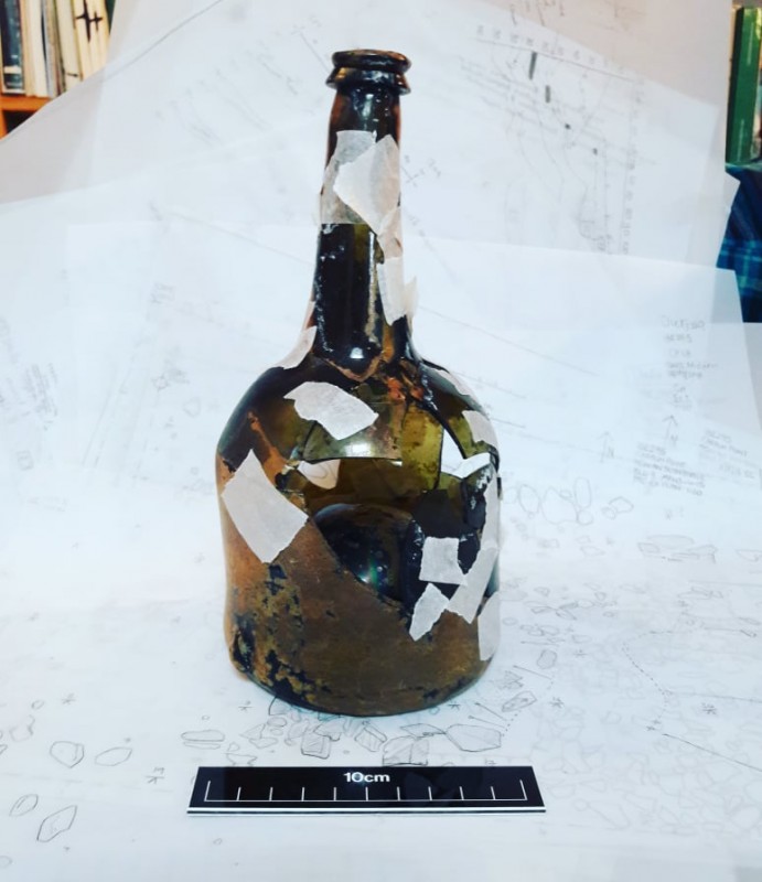 This week we found four glass bottles dating to the 18th century; three partially surviving examples from inside the building, and a fourth—almost complete example—from the area to the north of the house. We had a lot of fun refitting the latter bottle in the lab! These bottles are an exciting find and they challenge us to reassess what we think we know about life in 18th century Ireland. By analysing the form of the bottles we will be able to date them reasonably accurately.