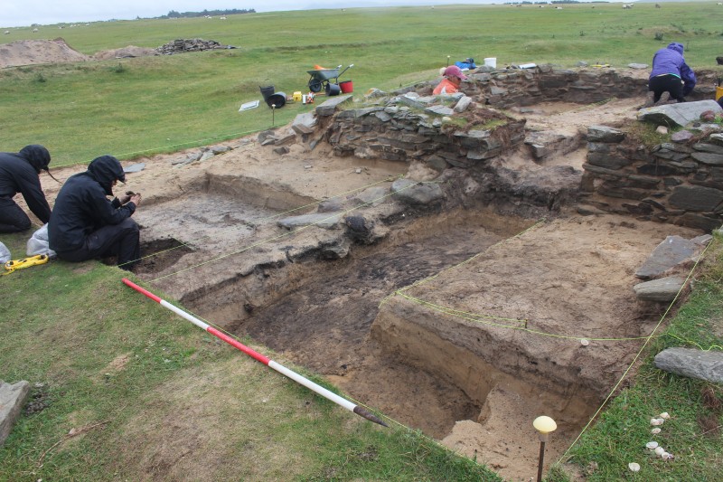 During week 13 we continued to investigate the interior of the building. With the secondary deposits almost entirely removed we are now in primary occupation material. Dark occupation layers composed of sand and peat cover most of the internal floor area, and are suggestive of the repeated addition of both materials to the floor surface. Along with occasional pieces of marine shell we are finding fragments of butchered animal bone and green glass, but so far only three tiny sherds of pottery—coarse red earthenware—have been found.