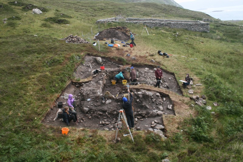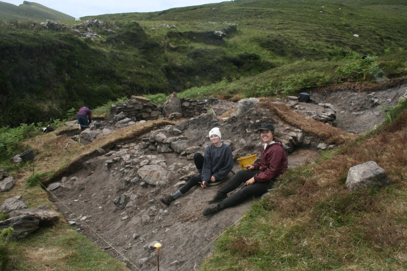 Having removed all of the collapse layers from the building, this week we began drawing the faces of the baulks to record the vertical stratigraphy of the site. Towards the end of the week, once these drawings were complete we removed the cross baulks. With the baulks removed we have a much better sense of the size and organization of the building. It means too that we can now investigate the doorway, which was concealed under one of our baulks. Continued work around the exterior of the building has revealed a number of areas of possible paving or cobbling. An area of flat stones leading up to the doorway seems to be a rough pathway, and another area of smaller stones at the side of the building may constitute a rough cobbled surface. The weather took a turn for the worse this week, so instead of our planned hike on Wednesday, we took a trip to the Museum of Country Life at Turlough Park, Castlebar. The museum houses the state’s ethnographic collections, and the visit helped us to reflect on the building we are currently excavating. Continued rain on Friday meant we stayed in the office to carry out post-excavation work including digitizing site drawings, as well as planning for our site open day next Thursday 21 June.
