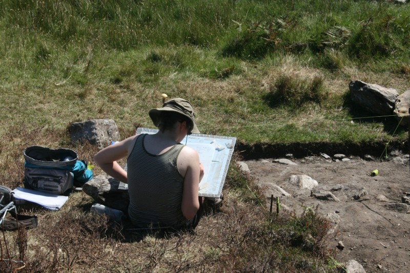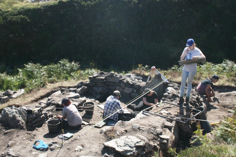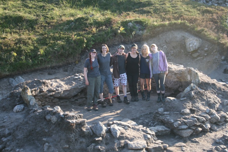 This was our final week at Keem. With the highest temperatures seen in Ireland since the 1970s, work was hot and slow-going. We focused on resolving the interior of the building and finishing all our drawing and recording. On the interior we completed excavating the hearth area, located diametrically opposite the doorway. Here up to five hearths had been recut in the same location, indicating episodic occupation or reuse of the building. We excavated a sondage in the south-west corner of the interior of the building to examine the floor material. The cutting showed that quantities of soil filler had been brought into the building to raise and level out the floor after the walls had been constructed. After all the drawings and context sheets had been finished we set about giving the trench one last clean in preparation for the post-ex photogrammetry model. With intense sunlight creating deep shadows we had to wait until late in the evening to get the photographs we needed. The last task before backfilling could begin was to survey in the corners of our trench using the total station. We began backfilling on Thursday amid record high temperatures. On Friday we took a well-deserved rest with a visit to Carrighooley Castle and Burrishoole Abbey.