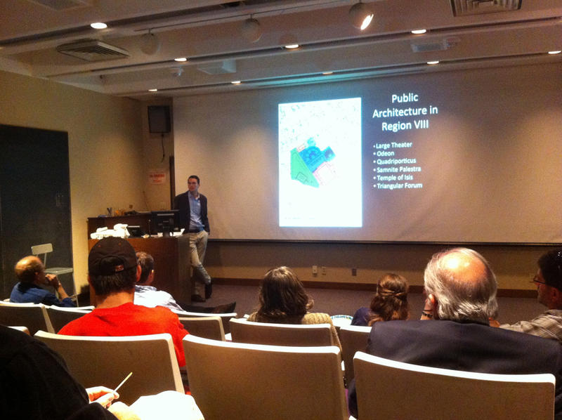 The Central Texas Society of the AIA celebrated International Archaeology Day 2013 by holding its sixth Annual Ancient Archaeology Playdate, in which faculty and students at UT Austin present the results of their current fieldwork and research. The playdate is organized by Professor Rabun Taylor, who presided over this year’s presentations. There was a series of exciting reports this year, oriented heavily to Pompeian research: Ivo van der Graaff, a recent PhD in UT’s Art History program and currently a lecturer in Classics, discussed his innovative dissertation work on the walls of Pompeii; Jackie DiBiasie, a PhD candidate in the Classics department, presented some preliminary conclusions about the distribution of graffiti in Pompeian houses, the topic of her dissertation; and Ben Crowther, a second-year PhD student in Classics, discussed his summer research on doorways and access to public space around the Quadriporticus near the Triangular Forum at Pompeii. Undergrad Ryan Baker rounded out the session with an exciting presentation on his work with UAVs and aerial 3D photogrammetry. A highlight of the afternoon came when Ryan passed around one of the drones his start-up company has built. The audience included both members of the general public and the UT community, and ranged in age from elementary school students to senior citizens.
