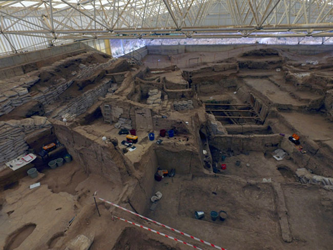 The preservation of the nine thousand-year old site of Çatalhöyük, located on the Konya plain in Turkey, is threatened by the fragile composition of its ancient mud brick structures and the region’s harsh climate. The site, a rare example of a well-preserved Neolithic settlement, was home to between 3500 and 8000 people from about 7,100 to 6,200 BC. The mud brick houses in the street-less settlement were built back-to-back and accessed via the roofs. In 2012 the settlement was declared a World Heritage site because of its importance to understanding human development and social organization at a time when the first agricultural settlements were being developed in Southern Anatolia. The site also gained attention for the presence of large amounts of symbolic and ritual artifacts, including wall paintings and reliefs.