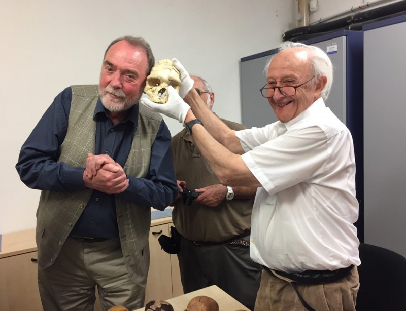 Most excitingly, at about the 430,000-year point, the cave yielded the broken fossil remains of several individuals of an extinct Homo species, now housed at the Museum in downtown Tautavel. These are some of the most famous of all the fossils documenting the prehistoric hominid occupation of Europe. After scrambling up a high cliff to visit the cave itself, our group repaired to the Museum and was warmly received by the cave’s excavator (and the Museum’s founder) Professor Henry de Lumley, Director of Paris’s Institute of Human Paleontology. Superseding the planned tour of the public exhibits Professor de Lumley spent an hour with us in the Museum’s strongroom, demonstrating and discussing the original Arago fossils as tour leader Ian Tattersall translated, and the two scientists traded jokes. For many of us, this unscheduled encounter with those hugely important early Europeans turned out to be the high point of the entire trip.