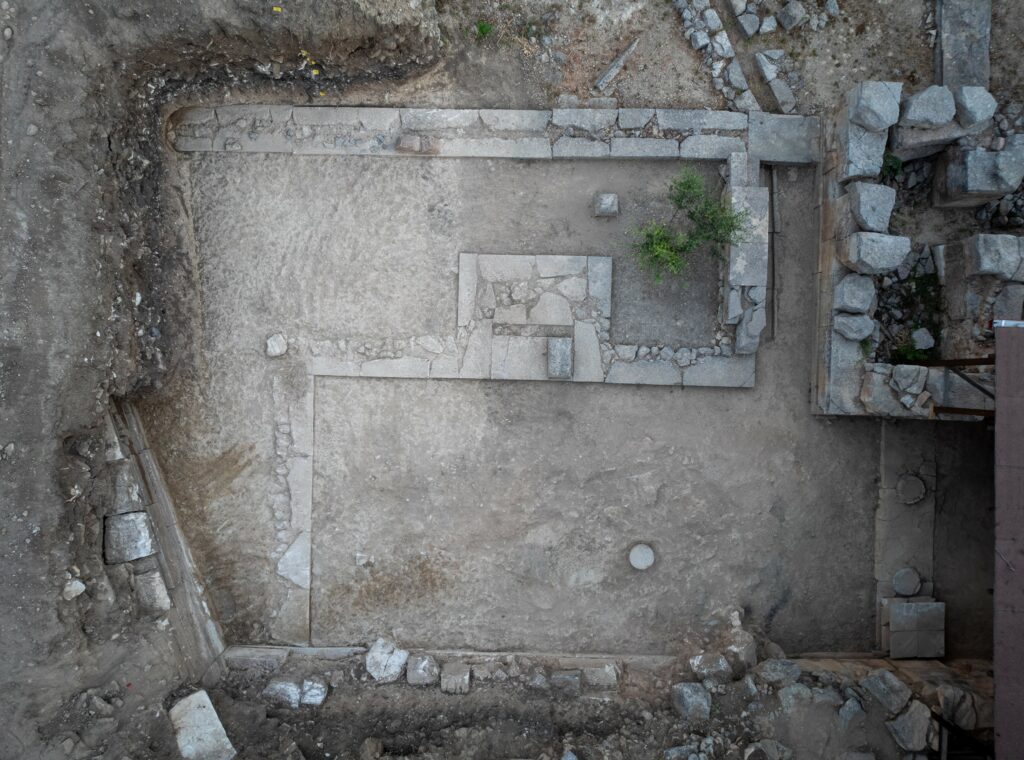 East of the “Gate Shrine” and south of the main entrance, a stone base, fragments of charcoal, and four bronze artifacts were discovered. They are probably parts of a wooden xoanon fallen from the upper floor of the eastern part of the building.