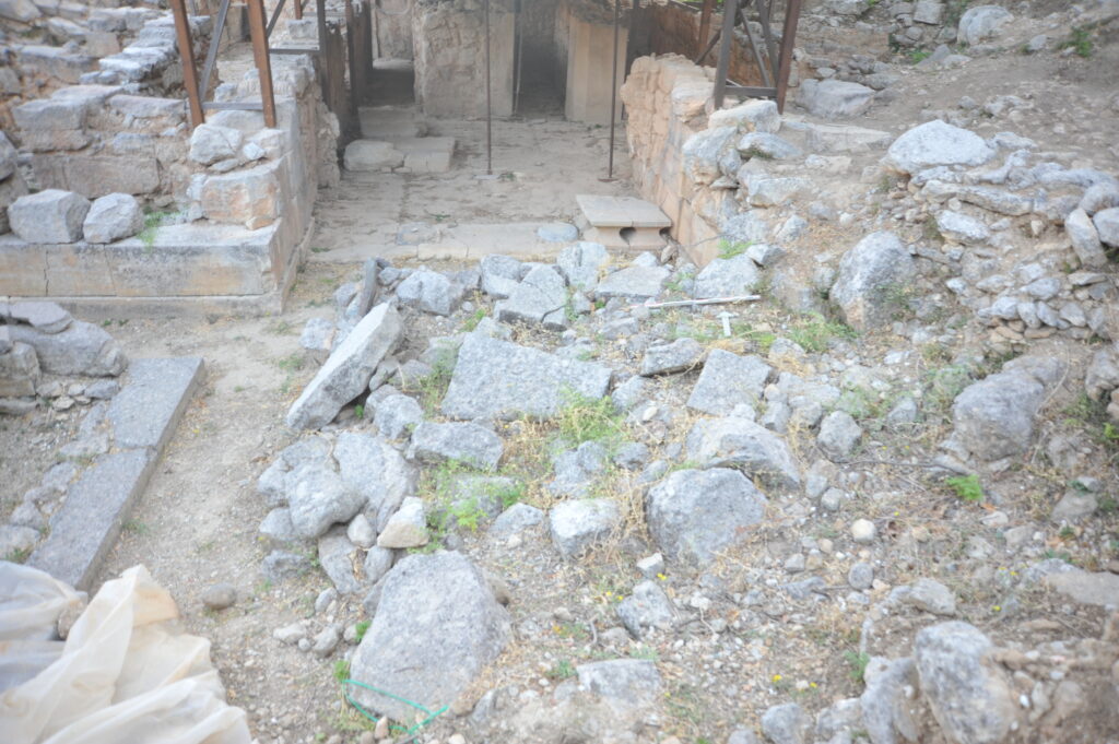 The southern part of this year’s research took place in a courtyard south of the entrance with the four incurved altars. A section of space of 96 sq.m. was excavated (Fig.4) under a number of fallen blocks, especially on the east side (Fig.5). The thick upper layer in the southern section was disturbed with mixed pottery of different periods. Beneath this disturbed layer, a Mycenaean layer that had been destroyed by fire was revealed.