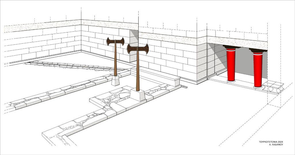 The Mycenaean layers covered the very important Minoan rectangular construction. This construction lies southwest of the main entrance of the palace with the four incurved altars (Fig.6). The construction includes two more altars, the oblong and the stepped discovered in older excavations (Y., and E. Sakellarakis, Archanes : Minoan Crete in a New Light, Vol. I & II,Athens, 1997), a platform and at least two stone bases of double axes. This architectural complex belongs to a “Gate – Shrine” (Fig.7).