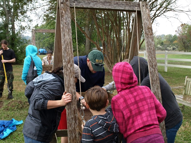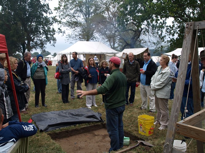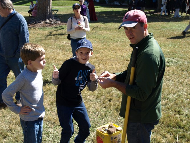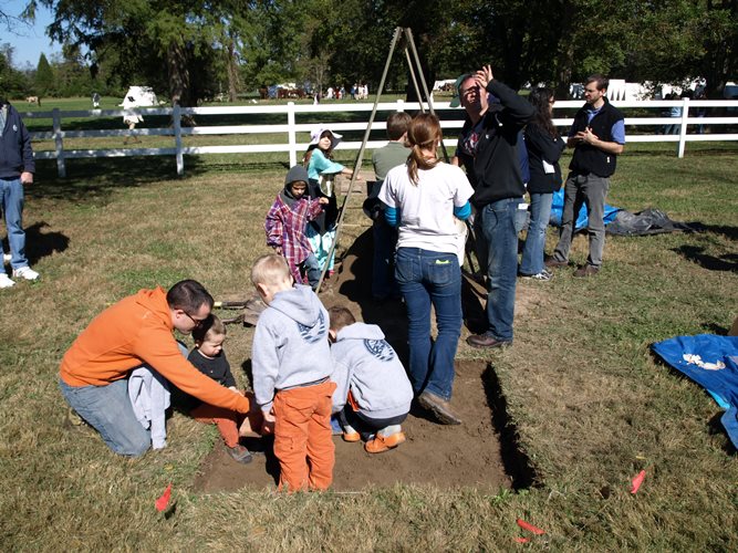 The Fairfield Foundation hosted a public excavation for International Archaeology Day at a Revolutionary War reenactment event in Gloucester County on October 19, called the Battle of the Hook. Several hundred people stopped by the open excavations to hear an update on why they were digging, what they were finding, and what they had already found out about the landscape where the Battle of the Hook took place. A steady stream of children and adults also lent a hand to the excavations, either trying their hand at digging with shovels and trowels or taking a turn screening through the dirt to find artifacts. The event was a great family-oriented opportunity to spread the word about archaeology to the public, and the Fairfield Foundation can’t wait to host excavations at the Battle of the Hook again the future.