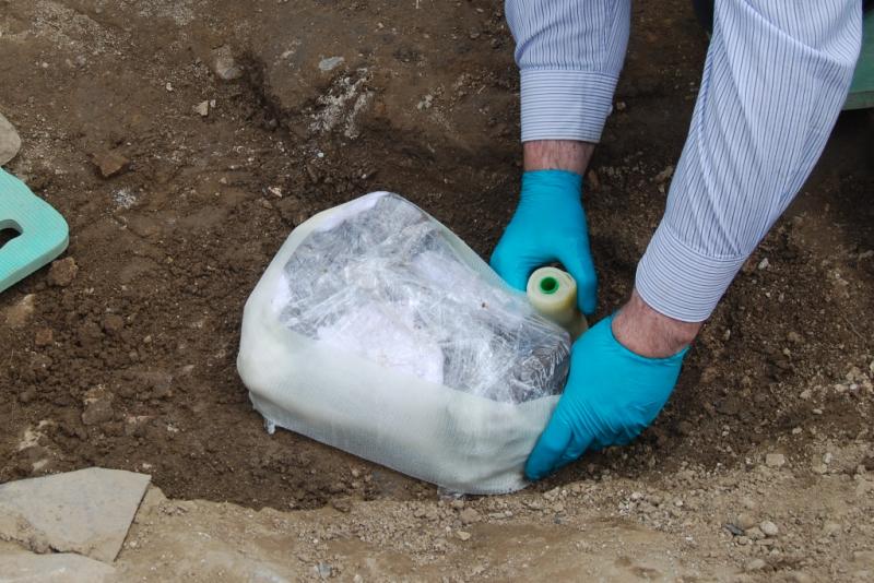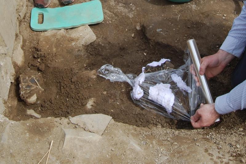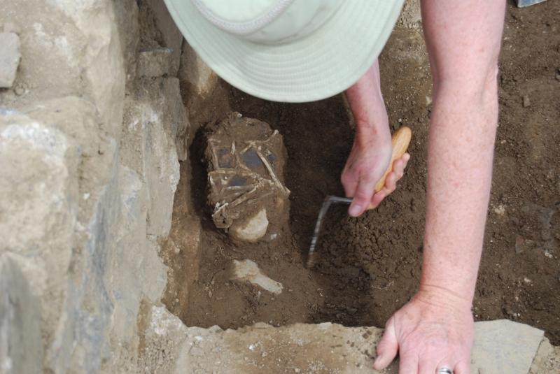 At the start of this 2015 season we resumed work in Cutting 6. This cutting had started out as a small 5m by 5m cutting opened to find the NE corner of the cloister in 2012. In 2014 it was hugely expanded to a 20m by 20m to explore the remains of the East Range, and the initial explorations were very rewarding. So far we’ve uncovered the full width of the East Range, part of the garden plots to the rear of the building, and the cloister ambulatory (the path the friars walked on around the cloister), to the front of the range. Within the range we found probably our most significant finds to date, stained glass still within its matrix of lead kames, some of which survived in sections up to 30cms in length. The collection of medieval window glass found to date, a considerable part of which is painted or stained glass, has just recently been taken to the School of History, Archaeology and Religion in Cardiff University where it will be conserved under the direction of Ms Jane Henderson and her students who will be undertaking BSc and MSc courses in conservation. We are really excited that this extensive collection (over 1300 pieces and counting) is being conserved.