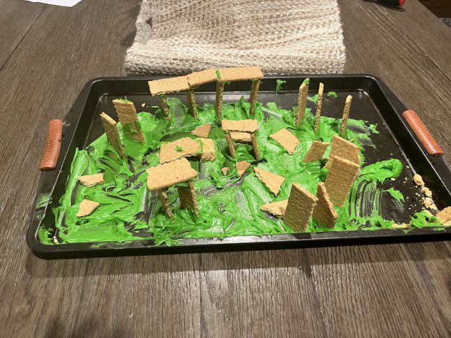Green icing, cooking pan, gram crackers
