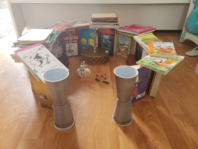 I used books, old board game figures my grandpa used to play with, silver colored cups, and metal basket lid.