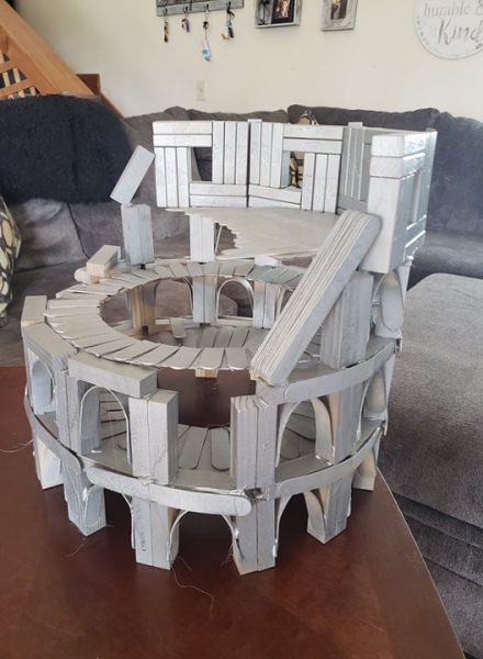 Jenga blocks, cardboard, popsicle sticks, hot glue gun, and spray paint.