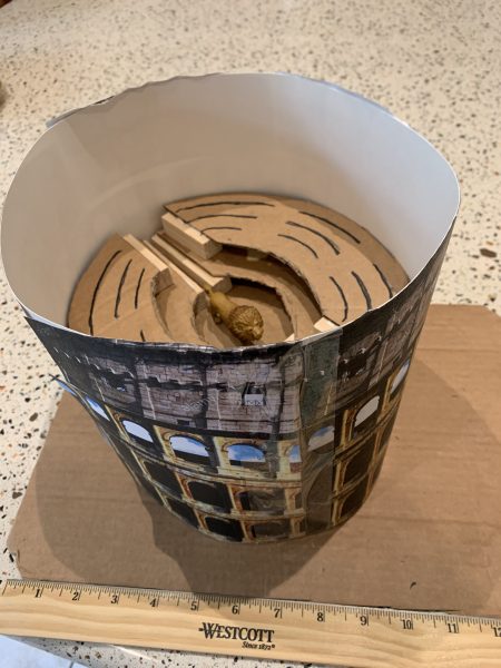 Cardboard, construction paper, tape, staples, wood, plastic cup, sharpie