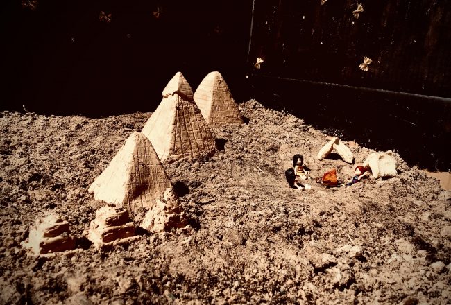 Clay (Pyramids), Dirt, Lego Figures, Bowtie Pasta (Stars) , Bread (Tents), Acrylic Paint, Cardboard (Background Sky), Mulch, Paper (Fire Flame)