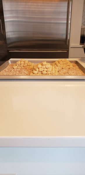 Graham Crackers and Rice krispies for sand, sugar cookie dough and paper towels for pyramids, on a metal cookie sheet.