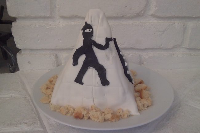 Cake, frosting, sugar water, fondant