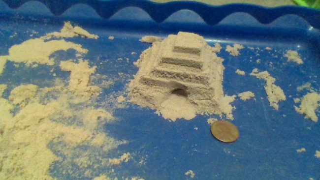 Kinetic sand, tray, pocket knife to shape sand, penny for scale