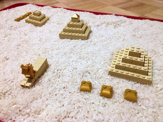 I used LEGO bricks for the pyramids and Sphinx. The sand is uncooked white rice.
