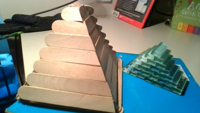 Popsicle sticks, Hot glue and Glass tiles.