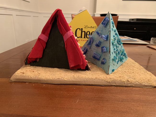 I used paint, glitter, sponges, fruit pebbles, velvet ,tickets, a cheerio box, clay, posca paint markers, cardboard, glue, popcorn, tape, and for the sand I used gram crackers.