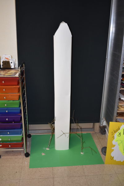 Cardboard, poster board, hot glue, sticks, clay and construction paper.