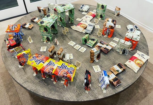 An assortment of noodle packages (including ramen), toasted seaweed (single-serve) packages, Korean tea bags, and painter’s tape.