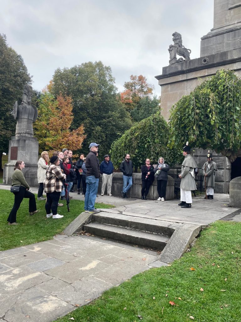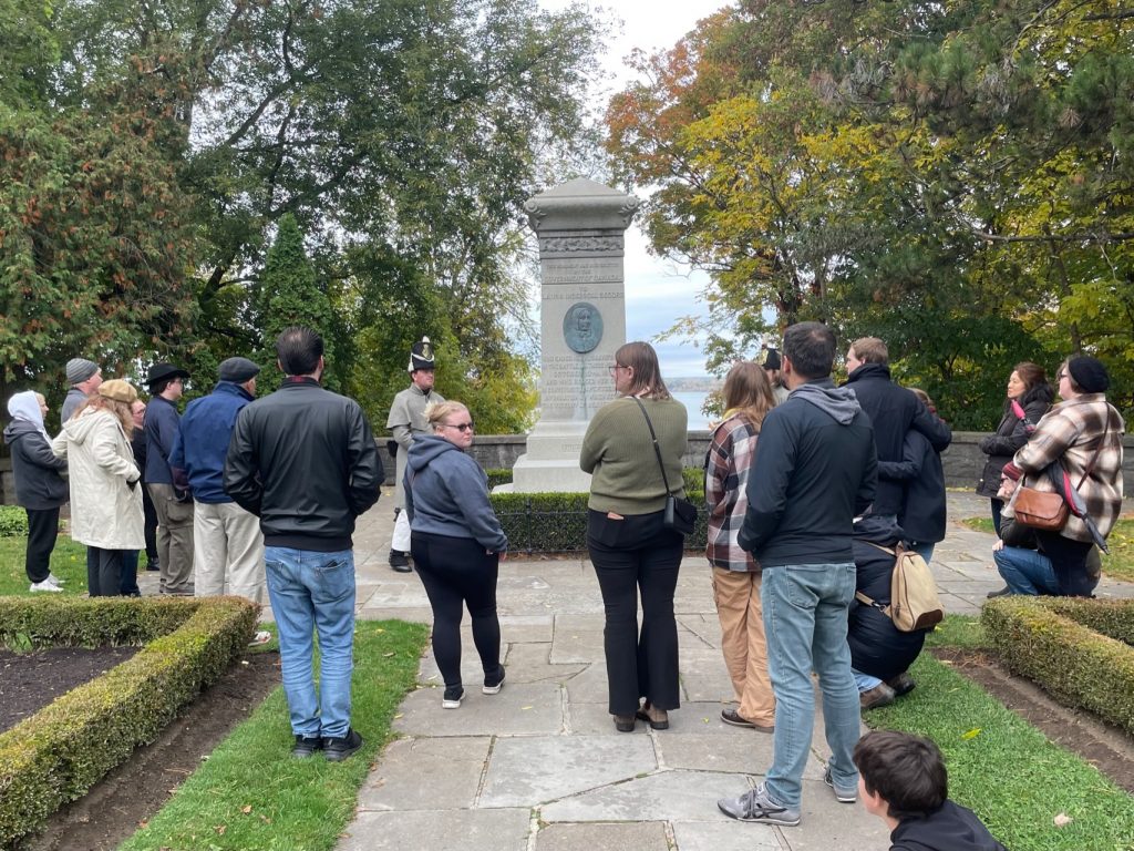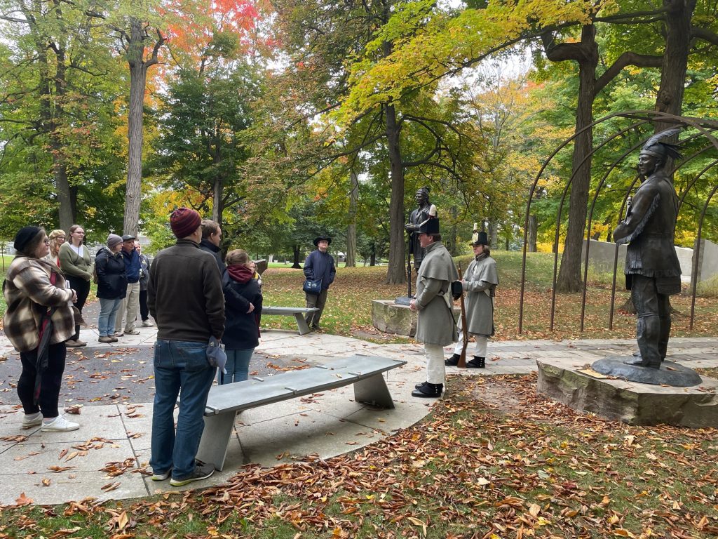On October 21st, the Niagara Peninsula Society of the AIA hosted an International Archaeology Day field trip to the Queenston Heights National Historical Site. Guides from the Friends of Fort George explained the history of the Battle of Queenston Heights and the War of 1812. Our walk brought us from the towering stone monument in honor of Major-General Sir Isaac Brock to the Landscape of Nations dedicated to the Haudenosaunee (Six Nations) Confederacy and Indigenous allies that participated in the War of 1812. We are grateful to the Friends of Fort George and Monument Lab’s brilliant Field Trip exercise; their guidance helped us to reflect on the multiple individuals and groups who played important roles in local military history and the transforming nature of public commemoration.