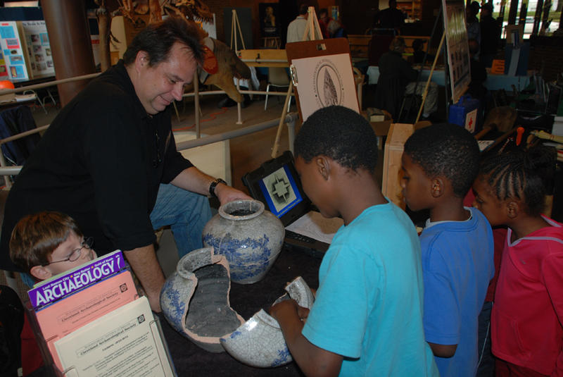 As part of the National Archaeology Day celebrations, the AIA-Cleveland Society, joined the Cleveland Museum of Natural History on October 13 to promote archaeology and earth sciences. This family friendly event featured interactive opportunities for archaeologists young and old to ‘restore’ pottery sherds, explore archaeological tools and methods, and learn more about archaeological work in northeast Ohio. Once again, the “AIA mummy” proved a popular photo op for visitors! Over 200 people visited the Archaeology Fair, making this one of the Cleveland Archeological Society’s most successful outreach events of the year!