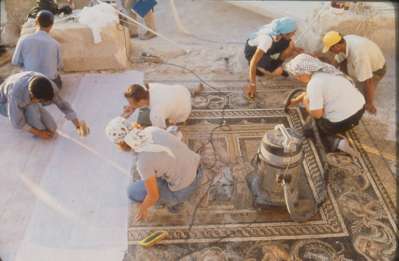 The ZAP2000 Project implemented new conservation treatment begun in 2000; piece by piece documentation permitted us to recompose the pavements individually and continue on to restoration. This operation, which lasted three years, produced 50 pavements, equivalent to more than 1,000 square meters; among which are some figured polychrome mosaics that now are part of the extraordinary collection of Turkey’s Gaziantep Museum. From a technical conservation standpoint, study of the original mortars gave us the information needed to reproduce new setting beds for the tiles. The conservators produced these new beds based on original techniques with the conviction that only such an approach could give the mosaic some of the stability it had lost when detached from its original location.