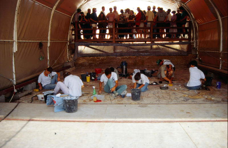 The Zeugma conservation program, ZAP2000, was implemented thanks to funding by the Packard Humanities Institute (PHI) in California. In 2000 a dike was built on the Euphrates River causing the formation of a lake at Zeugma that submerged some 30 percent of the Roman city. Before this happened—and before the phenomenon came under the control of the ZAP2000 project—the site had been the object of archaeological investigations that led to systematic detachment of all the mosaics. There was no selection, no professional conservators, and no documentation. The result was a heap of mosaics cut into pieces, glued to canvas or on cement, piled haphazardly outdoors in a museum garden or in storage, without properexcavation references or numbering.