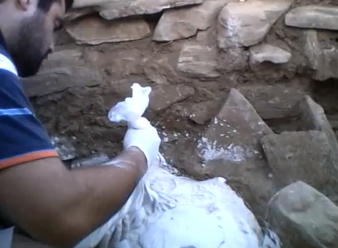 Making a mold for a big piece of carbonized wood that was revealed in Corridor 10 (in order to be removed intact)