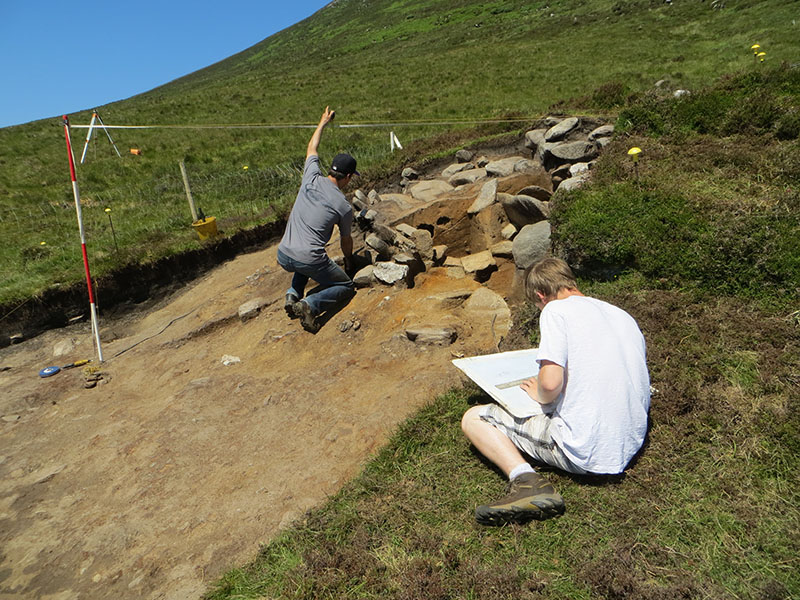 On Wednesday the field trip was to a small islet in the channel between Achill Island and Achillbeg Island, where a very fine promontory fort, Dun na Glaise (The Green Fort) is located. The site can be accessed only at low tide and we took the opportunity to walk out to the site and undertake a detailed survey of the impressive stone banks and the intriguing building that is situated within the interior. The site was damaged during the winter storms in January and February when high waves cut into the banks in several places around the islet. The team undertook a detailed GPS survey of the site, drawing a detailed plan of the building and a series of profiles over the surviving banks. This was an important surveying project as the future of this site is rather bleak, and the survey will provide a vital record of the site prior to its destruction. That we got to spend a beautiful sunny day in such a gorgeous location was a definite bonus! At this same location, in similar weather conditions a few years ago, several of the students took the opportuinty to have a quick ‘dip’ in the Atlantic Ocean.