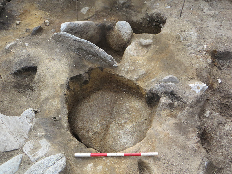 On Thursday the students enrolled in the 6-weeks course completed the plan of Quadrant 3 and then the area was covered over with Geo Textile held in place by a layer of sods, ready to be reopened in 2015. The team then moved on to finishing off the section at the north of Quadrant 2 within the inner building. Within this building in Quadrant 4 the two new Module 6 arrivals got down to the occupation surface and revealed the first of what would prove to be a series of overlapping hearths. Work continued on the pits in the centre of the trench, several of which proved to be quite substantial and very nicely excavated.