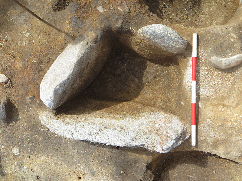On Friday the team in the interior of the inner building uncovered a second hearth underneath the first one they had discovered on Thursday. This second hearth was considerably larger and was on a different alignment to the first. The excavation of the pits in the centre of Quadrant 4 was largely completed and to our disappointment no artefacts were discovered in any of the pits. However one of the pits was found to have been nicely lined with upright stone slabs, whilst an almost perfectly circular pit at the east of the cluster was found to have its base covered by an almost perfectly circular stone slab. Whilst the discovery of these pits was a very pleasant surprise the continuing lack of datable artefacts was frustrating. However, on the plus side, we did retrieve a fantastic set of soil samples from them with enough charcoal that we will be spoilt for choice when it comes to decide which features we select for radio carbon dating.