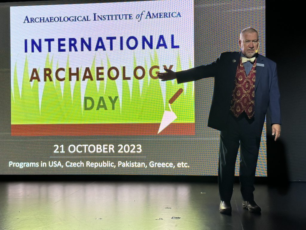 In Piraeus Harbor in Athens, Greece, Dr. Michael Fuller gave an International Archaeology Day lecture on the Viking Neptune Cruise Ship. The lecture, on “Greek Civilization and Archaeology,” was attended by 50 cruise guests! Dr. Fuller’s home institution is the St. Louis Community College Philosophy Department in St. Louis, MO.