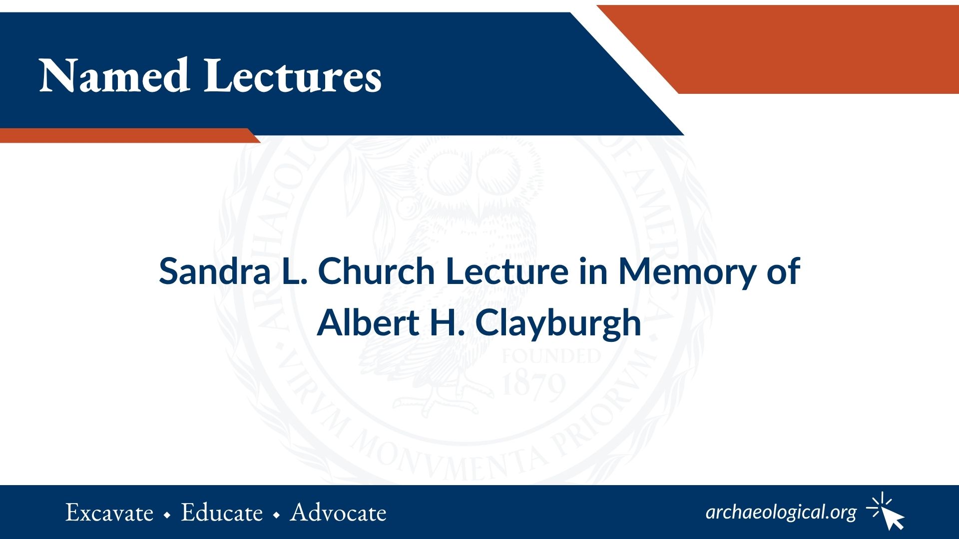 The inaugural Sandra L. Church Lecture in archaeology will be given at the Santa Barbara Society of the Archaeological Institute of America located at UCSB on April 15, 2002. This is the second lectureship that Ms. Church has endowed for the Archaeological Institute of America. A longtime member and supporter of the AIA, she established the Albert H. Clayburgh Lecture at the Princeton Society in memory of her late husband in 1999.