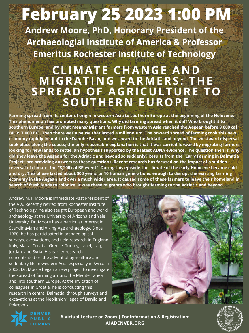 Andrew M.T. Moore is Immediate Past President of the AIA. Recently retired from Rochester Institute of Technology, he also taught European and world archaeology at the University of Arizona and Yale University. Dr. Moore has a particular interest in Scandinavian and Viking Age archaeology. Since 1960, he has participated in archaeological surveys, excavations, and field research in England, Italy, Malta, Croatia, Greece, Turkey, Israel, Iraq, Jordan, and Syria. His earlier research concentrated on the advent of agriculture and sedentary life in western Asia, especially in Syria. In 2002, Dr. Moore began a new project to investigate the spread of farming around the Mediterranean and into southern Europe. At the invitation of colleagues in Croatia, he is conducting this research in central Dalmatia, through surveys and excavations at the Neolithic villages of Danilo and Pokrovnik.
