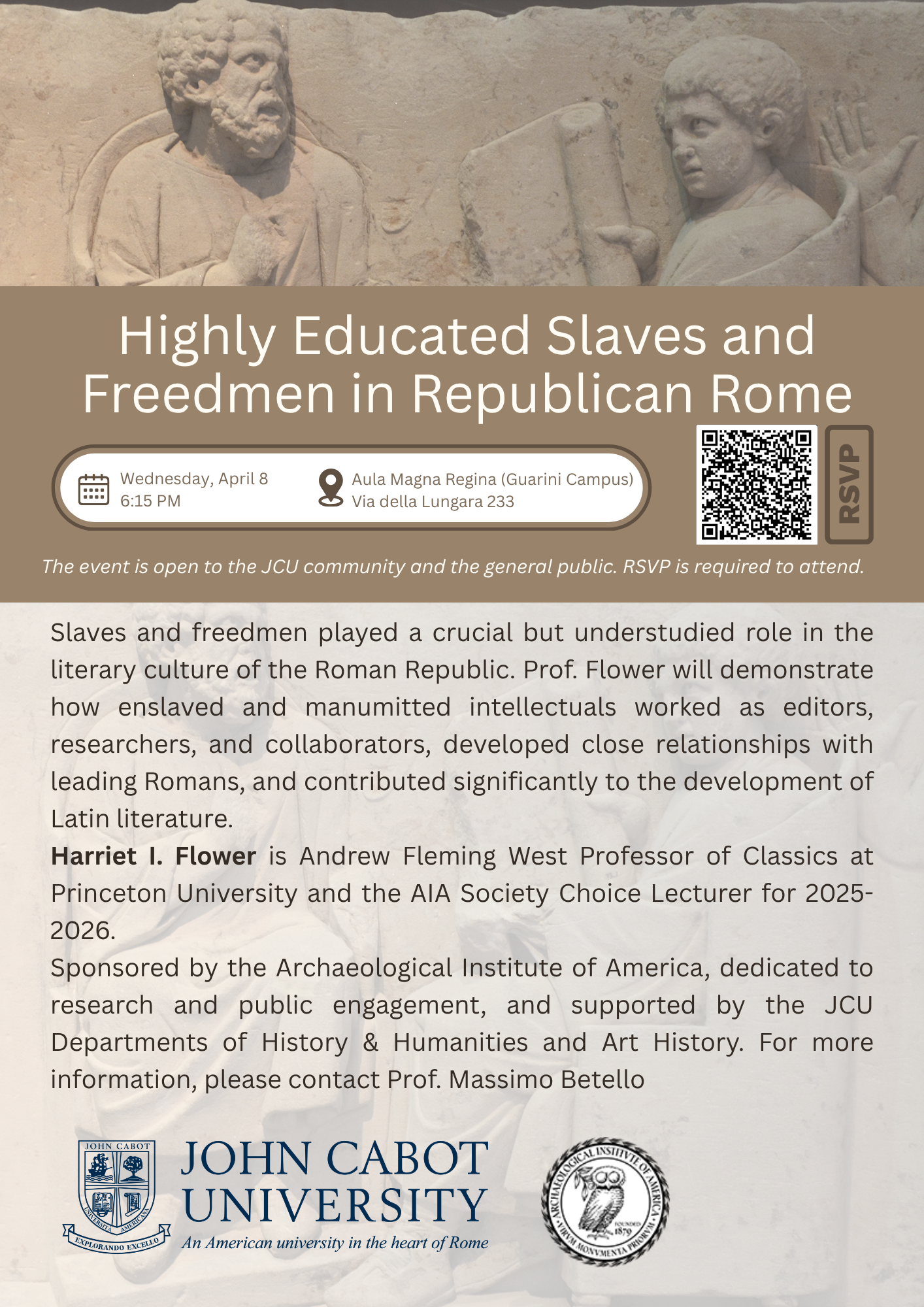 During this public lecture, Prof. Flower (Princeton University) — Rome-SPQR Society Choice Lecturer – – will illustrate the stories of these gifted and highly educated young men, from Licinius the flute-player, who shaped the rhetorical style of the orator Gaius Gracchus, to the grammarian and teacher Tyrannio of Amisus, who was brought to Rome as a war captive.