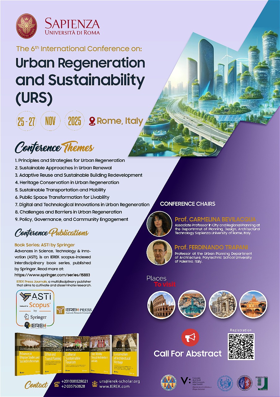 The “Urban Regeneration and Sustainability” conference explores the intersection of urban renewal, environmental sustainability, and social inclusivity in city development. It addresses the methodologies and strategies for revitalizing urban spaces, including infrastructure enhancement, sustainable architecture, and economic revitalization. The conference highlights best practices in smart city technologies, heritage preservation, green infrastructure, and innovative urban design solutions that foster resilient and livable cities. It also examines policies and governance frameworks that drive successful urban regeneration projects, ensuring that urban transformation efforts align with sustainability goals.