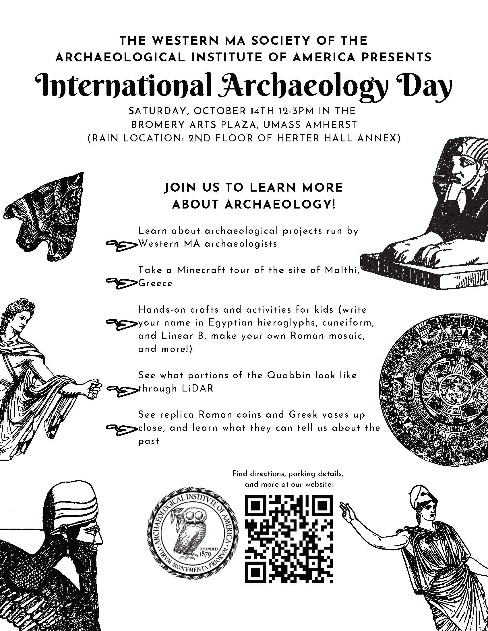 In honor of International Archaeology Day, please join us for an archaeology fair on Saturday, October 14, 12:00-3:00 pm. Visit activity tables to learn about the past: write your name in ancient scripts, make a curse tablet, hold replicas of ancient vases and coins, and more! Browse the book sale of donated Classics and archaeology books and hear about local archaeological remains at the Quabbin Reservoir.
