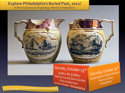 The Philadelphia Archaeological Forum and Independence National Historical Park Archeology Lab will be co-sponsoring a day of talks about archaeology along the Delaware River at the Independence Seaport Museum (Penns Landing, Philadelphia, PA) on National Archaeology Day, Oct. 20th, 10am-4pm. Program Schedule at www.phillyarchaeology.net