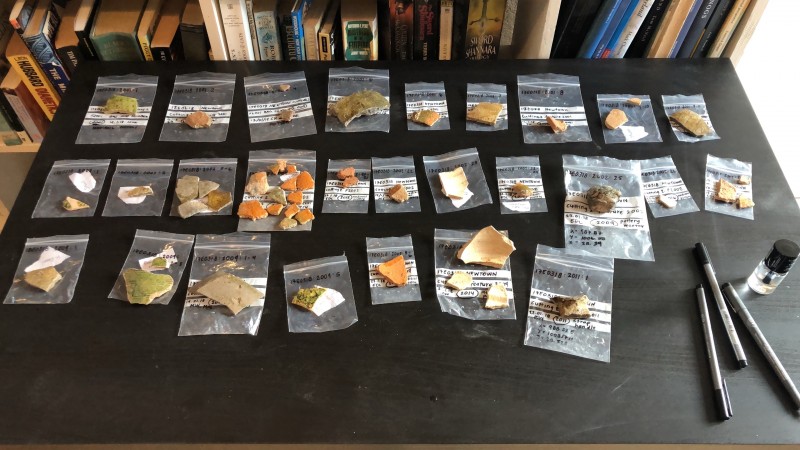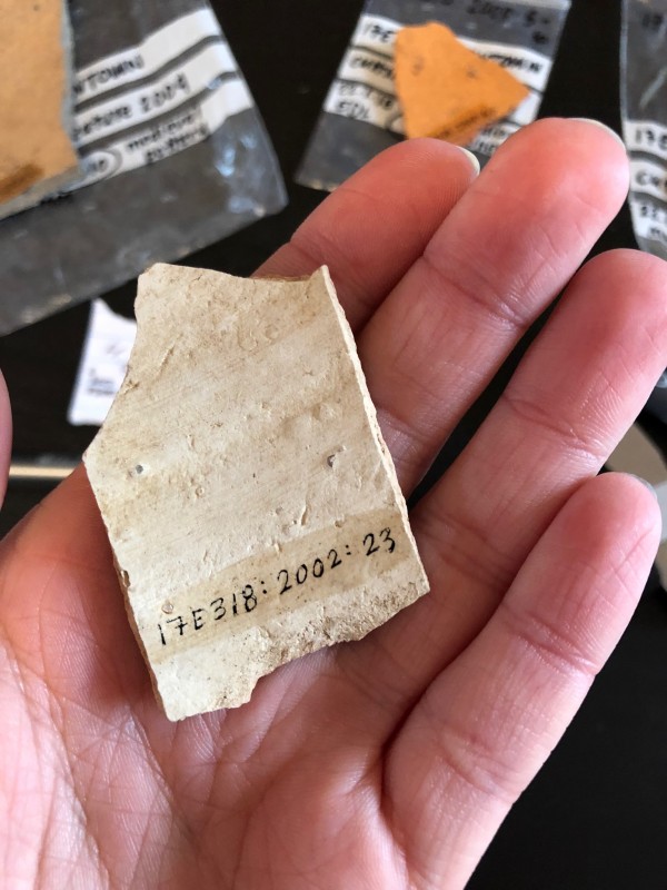 After our day with Clare, I spent most of Thursday working with the pottery. I took the information she shared and updated the museum database with the correct identifications. Once each piece was updated, I began labeling the sherds with their corresponding museum identification number. This number is a combination of the excavation license number, the feature or context number, and the individual find number (for example, 17E0318: 2001: 1) and is written on the pottery itself. To do this, I applied a varnish on each piece, let it dry, and then used a permanent pen to mark the number.