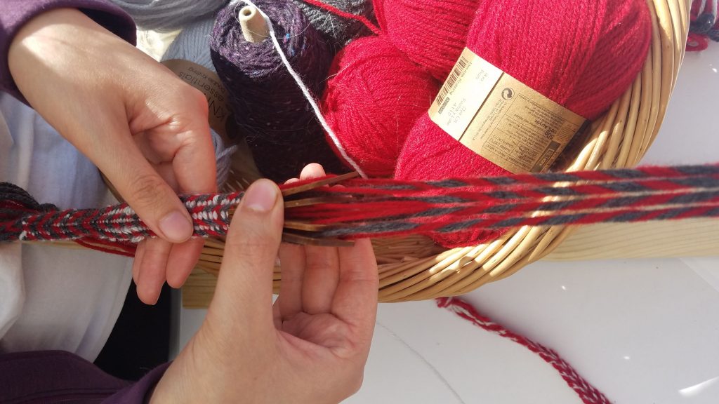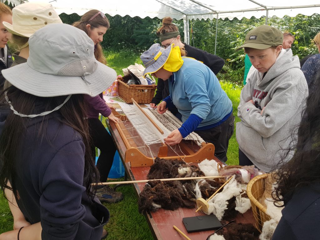 At the end of the week, Dolores held a medieval textile workshop for the students. Textiles tend to be overlooked in archaeology, as it is quite rare for them to survive. It was interesting to learn about them and be reminded that textiles would have been plentiful on a medieval site such as Carrick. I studied costuming a bit during my undergraduate degree and was excited to learn more about this process in particular. We learned how to process raw wool, including cleaning it and spinning it into yarn using hand spindles. We were also introduced to various types of weaving. One type that stood out to me was tablet or card weaving, which would have been used to make decorative borders for cloths or belts.