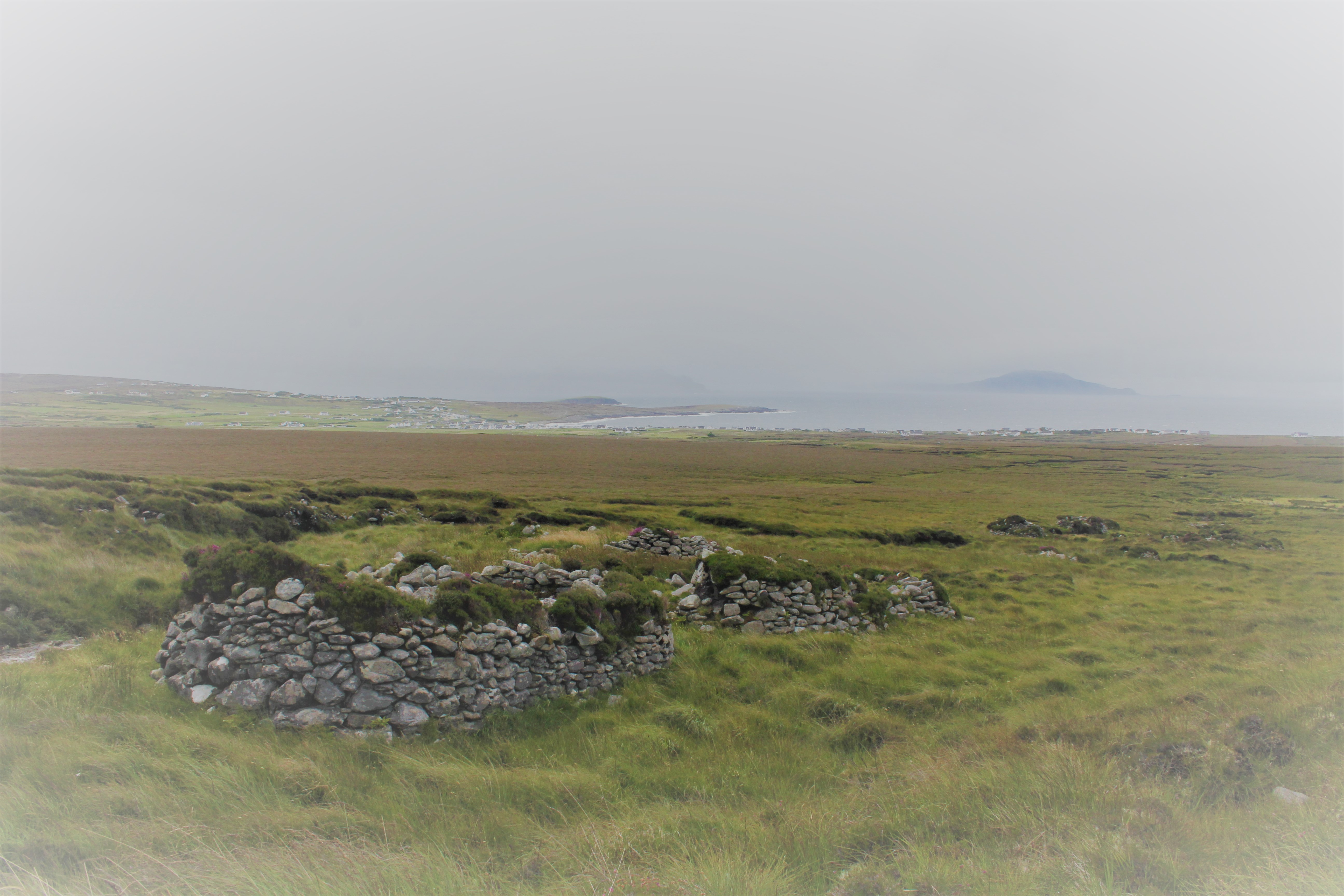 Tamnaghmore (great meadow), a small enigmatic settlement, which probably dates to the late/post medieval period. Tawnaghmore is a nucleated settlement of 16 unplanned houses running in a linear fashion over 170m of ground at an elevation of 97m asl. The site is located on ground sloping gently south-eastwards, along the left and right banks of the Abhainabhaile River, which flows in a south easterly direction and enters the sea at Dooagh. Access to Tawnaghmore from Dooagh is along the banks of the Abhainabhaile River, following a bog road, a narrow grass-covered track and a glacial ridge to reach the site. There is no visible road/track into the settlement. To the north east is a grass and bog covered linear settlement with an unknown number of houses called Caislean which may suggest the presence of a Cathair (stone fort) in this area sometime in the remote past. A pollen core taken in 2005 indicated the presence of a deciduous forest in this area during the mid to late Neolithic (Caseldine, C. 2005, 169-178).