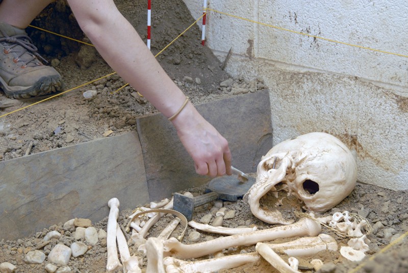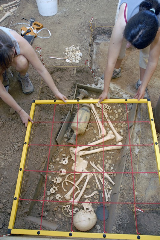 The dig simulator features reconstructed architectural ruins and diagnostic archaeological contexts (hearths, kiln, well, houses, shrine, cist and pit graves, a rock-cut chamber tomb, part of a collapsed fortification wall), plotted portable finds and spatial distribution of physical remains, including artifacts (reproduced pieces of pottery, figurines, jewelry, tools and weapons) and ecofacts (casts of human skeletons, animal bones and teeth, carbonized wood, organic remains and other bioarchaeological material), and reproduced stratigraphy filled with different types of sediment (occupation layers, destruction layers, floor levels, burnt deposits).
